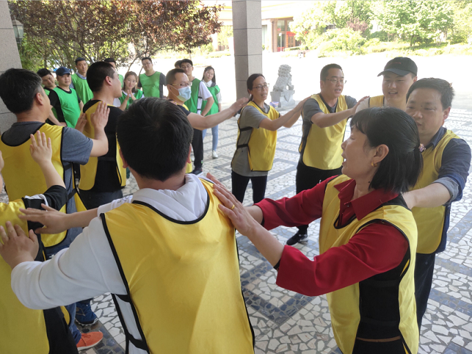 活動(dòng)開(kāi)始,教練團(tuán)隊(duì)將大家分為兩個(gè)組并布置了任務(wù)。在規(guī)定的時(shí)間15分鐘內(nèi),每個(gè)隊(duì)設(shè)計(jì)了自己的隊(duì)名、LOGO、隊(duì)歌、團(tuán)隊(duì)造型,選出了隊(duì)長(zhǎng)和隊(duì)秘,并分別進(jìn)行了展示。這些是團(tuán)隊(duì)精神和集體智慧的體現(xiàn)。兩隊(duì)之間既有合作,又有競(jìng)爭(zhēng),比賽輸?shù)囊环綍?huì)被“獎(jiǎng)勵(lì)”——俯臥撐。讓我們里牢記我們是一個(gè)集體,一人犯錯(cuò),集體承擔(dān)。這時(shí),我們每個(gè)人心中裝的都不再是我們自己,而是整個(gè)團(tuán)隊(duì)。